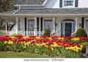 Landscaped Front Yard Of A House With Flowers And Green Lawn Stock ...